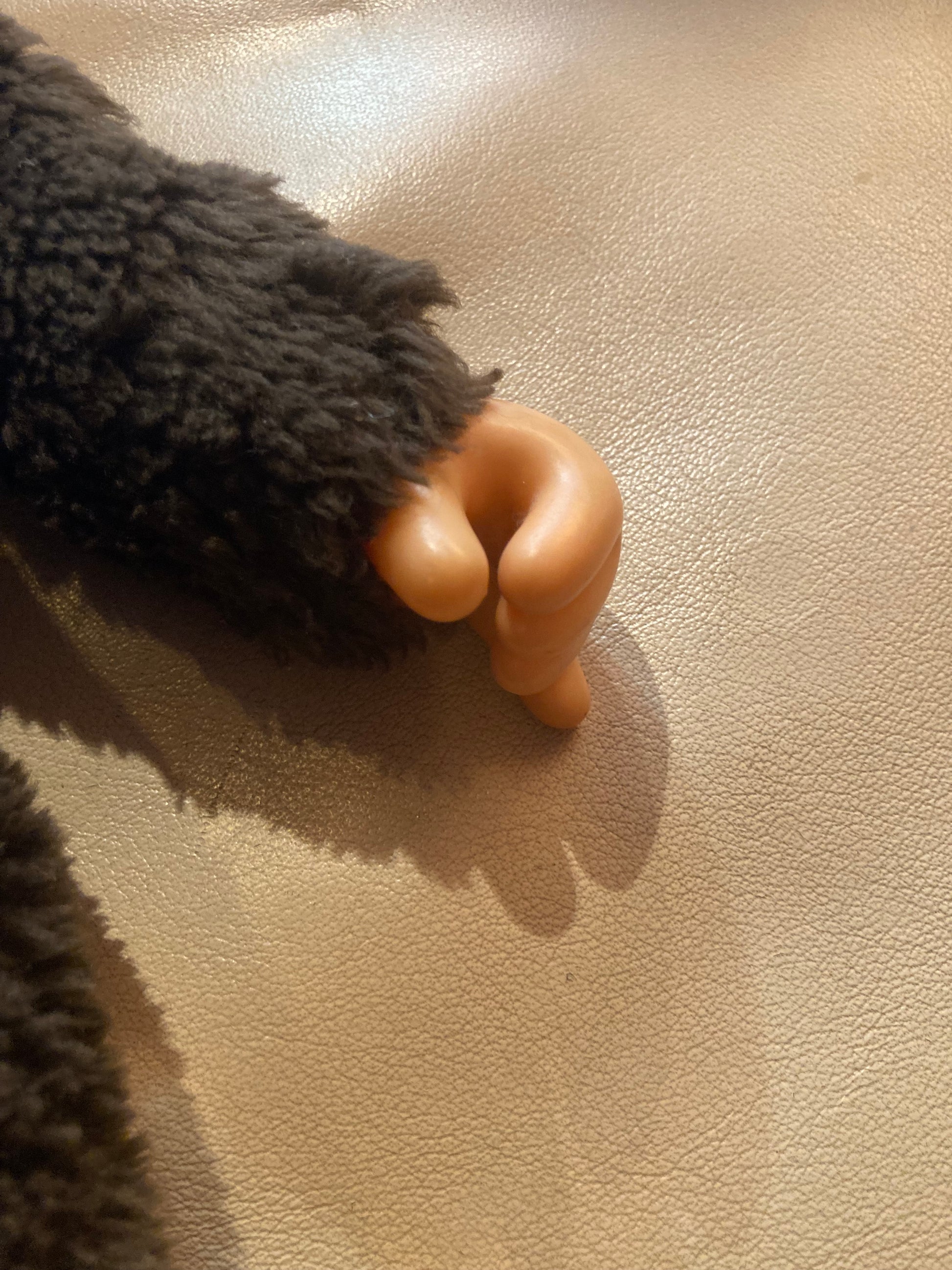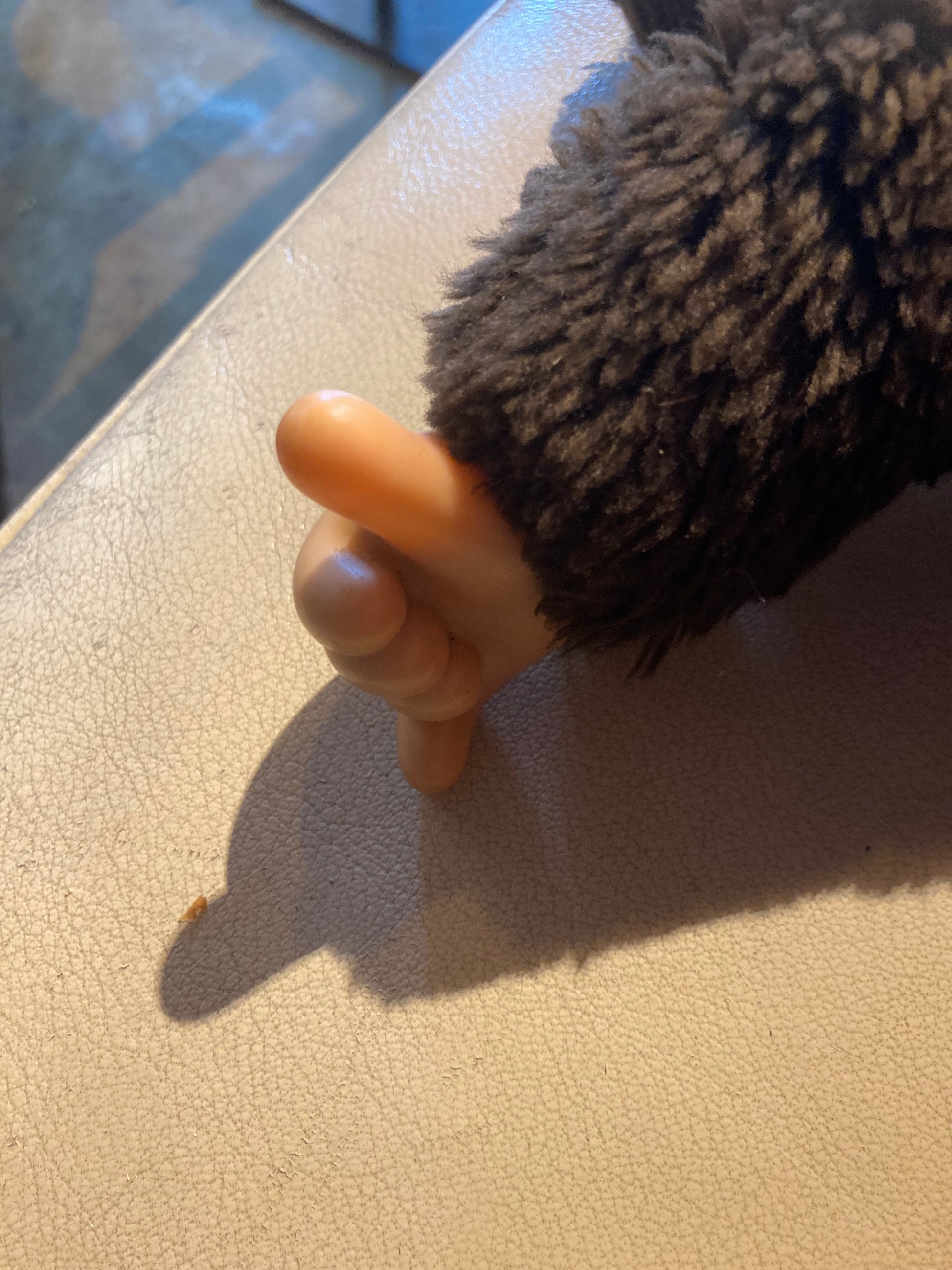 Dit betreft een zeldzamere, grotere uitvoering van circa 40 cm hoog. De pop verkeert in een uitzonderlijk mooie VG++ staat (Zeer Goed++), wat betekent dat hij er, zeker gezien zijn leeftijd uit de jaren '70 of '80, fantastisch uitziet met minimale tekenen van gebruik. De zachte, donkerbruine vacht is nog mooi, en het plastic gezichtje, de handjes en voetjes zijn in uitstekende conditie.
