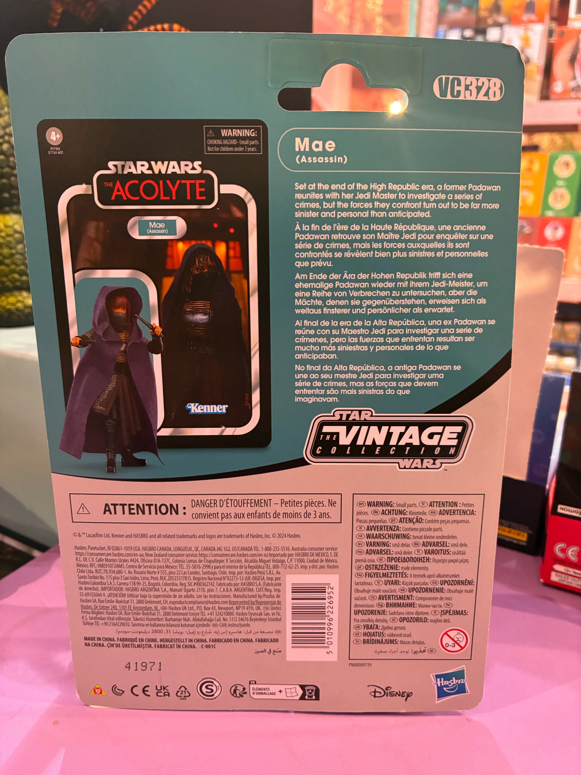 - Kenmerken: Retro Kenner-stijl cardback (The Acolyte branding), gedetailleerd ontwerp, inclusief dolken en afneembare kap/sjaal. VC-nummer #328.